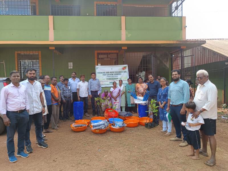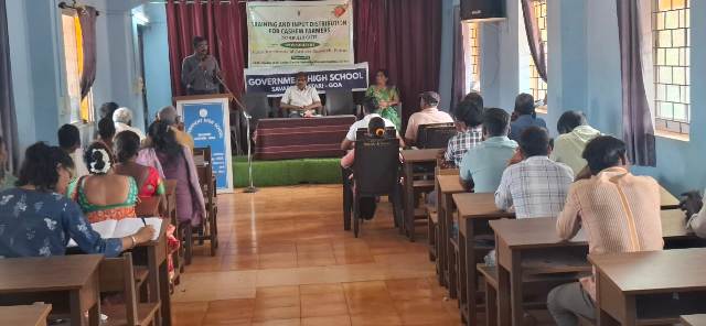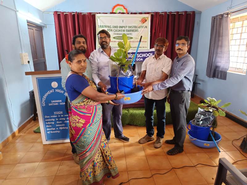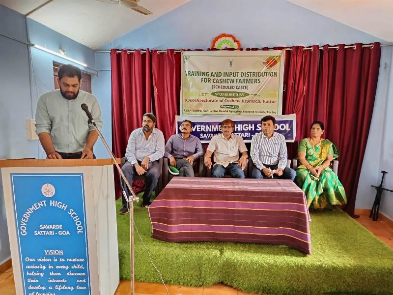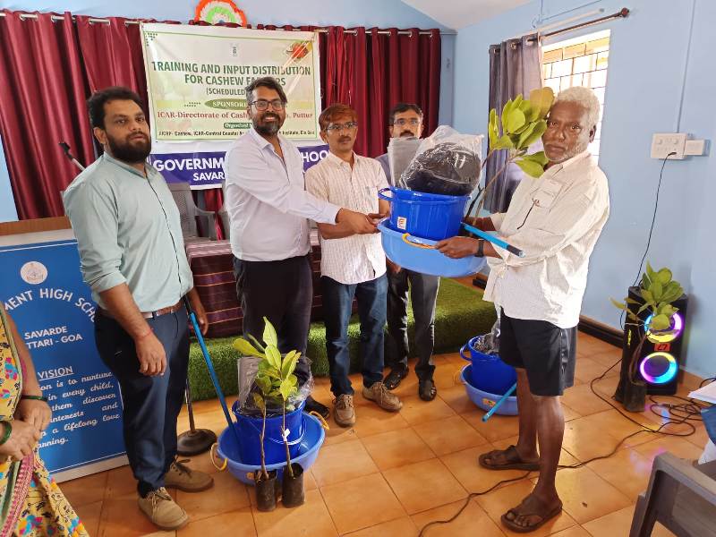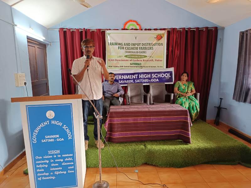 Dr. Sanjay M. Bandi, Senior Scientist (Ag. Entomology), ICAR-CCARI, interacted with the farmers and delivered a lecture on pest and disease management in cashew.Later, Mr. Omar de Souza, Technical Officer, ICAR-CCARI, spoke on nursery management of cashew and its scope as a commercial business model for generating employment opportunities for rural unemployed youth.As part of the programme, farm inputs such as tarpaulin sheets, gamelas, buckets, cashew apple collectors, and cashew grafts (Goa Cashew-4 and Goa Cashew-5) were distributed to the beneficiaries. A total of 30 beneficiaries participated in the programme, including 16 women farmers.The programme was graced by Smt. Akshata Gaonkar, Sarpanch, Savarde Sattari Panchayat, along with Shri Shivaji Desai and Shri Budhaji Mhalshekar, Panch members of Savarde, Sattari.The programme was coordinated by Dr. Akula Chinapolaiah, Dr. Sanjay M. Bandi, Mr. Omar de Souza, Mr. Sidhant Haldankar, Project Assistant, and Ms. Anuja G. Shinde, Young Professional-I (YP-I). The programme concluded with a vote of thanks proposed by Mr. Sidhant Haldankar.