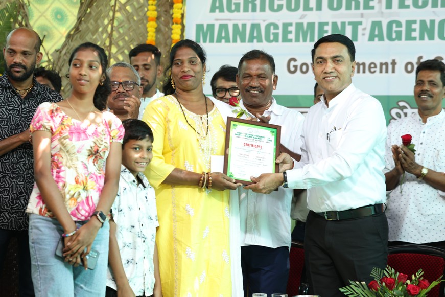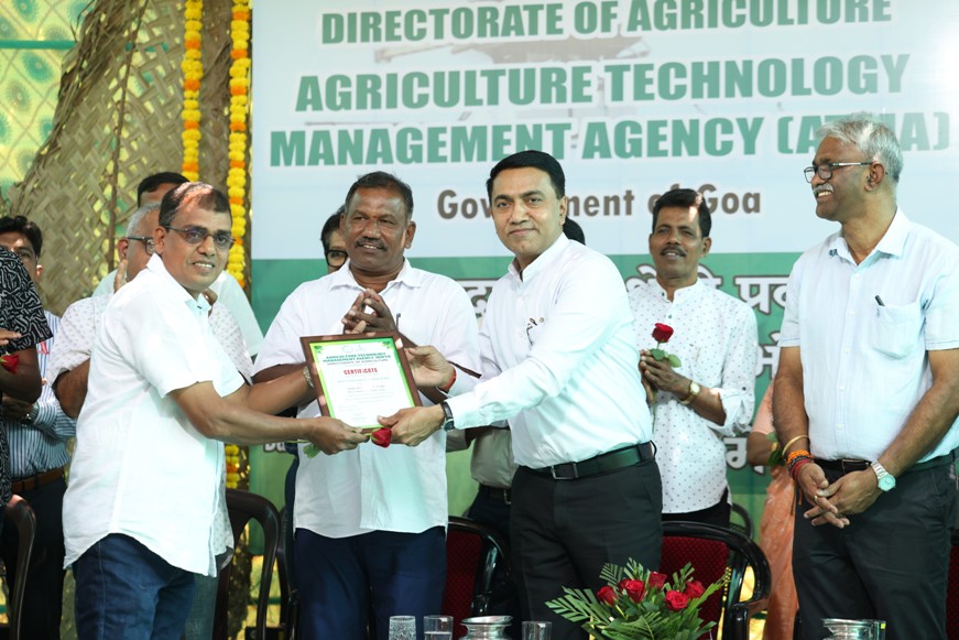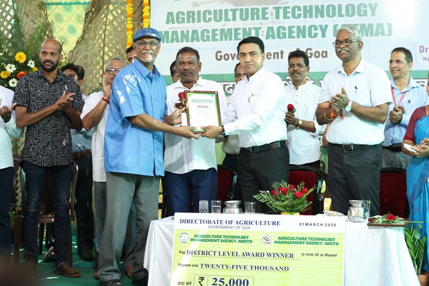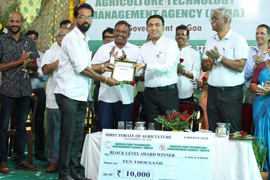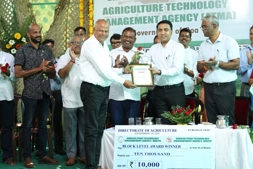 On the occasion, the Hon’ble Chief Minister felicitated outstanding beneficiaries of ICAR-CCARI and ICAR-KVK adopted farmers for their contributions to agriculture under the ATMA award 2025-26. He felicitated two district-level awards to Smt. Pobrinha Carvalho, Best Woman Farmer, and Shri Anthony D’Souza, Best Farmer IFS, each carrying a citation and a cash prize of ₹25,000, were presented and four block-level farmer awards were also presented to Shri Vishwas Kamlakant Chodankar, Best Pulses Farmer (Rabi); Shri Vishwambar Gawas, Best Vegetable Farmer; Shri Vishnu Mahadev Natekar, Best Paddy and Millet Farmer (Rabi); Shri Ravikant Ramchandra Naik , Best Vegetable Farmer (Rabi), Pernem each carrying cash prize Rs 10000/- and citation. A total of 128 farmers, including farm women, participated in the programme and benefited from the demonstration. The agri-drone demonstration on foliar nutrition was technically coordinated by Dr. N. Bommayasamy, Senior Scientist and Head, and Shri Vishwajeet Prajapati, Technical Officer (Computer), ICAR–KVK, CCARI, North Goa.