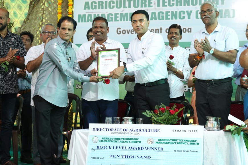 Dr. Pramod Sawant, Hon’ble Chief Minister of Goa, inaugurated ademonstration of foliar nutrition through an agri-drone in a community farming field at Surla, Sankhali, on March 1, 2026. The programme was organised by the Agricultural Technology Management Agency (ATMA) and the Directorate of Agriculture, Government of Goa. Addressing the gathering, the Chief Minister emphasised the importance of community farming in revitalising fallow lands, strengthening food security, and promoting rural economic development through community action. He said that agricultural income is tax-exempt and encouraged farmers to cultivate vegetable crops to secure quicker and higher economic returns.