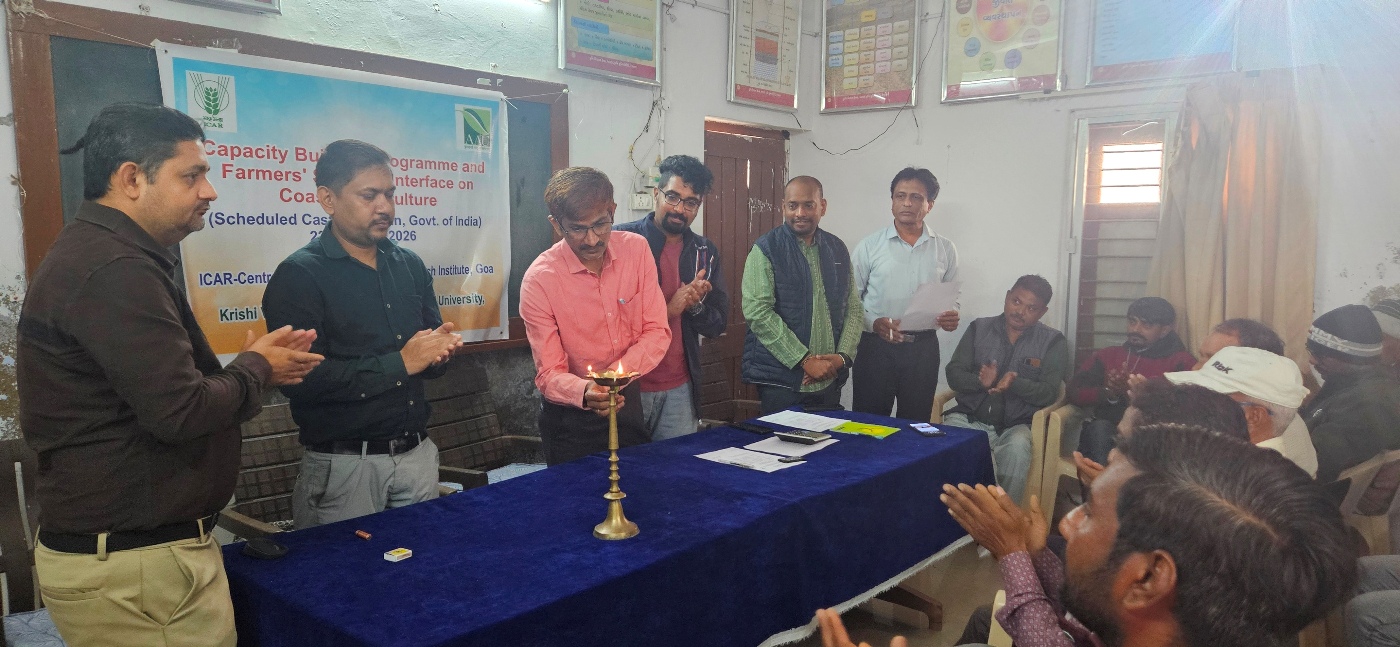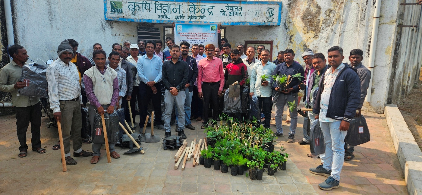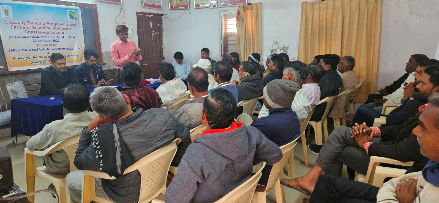 A one-day capacity building programme and input distribution programme was organized by ICAR-Central Coastal Agricultural Research Institute (CCARI), Goa at Krishi Vigyan Kendra (KVK), Devataj, Sojitra, Anand (Gujarat) on 22 January 2026, in collaboration with Anand Agricultural University (AAU), Anand, Gujarat. The programme commenced with the welcome address by Dr. R. M. Patel, Subject Matter Specialist (Plant Protection), KVK Devataj, Anand who welcomed all participants, scientists, and faculty members. The inaugural session began with the lighting of the lamp, followed by the University Agricultural Song of Anand Agricultural University, Anand.