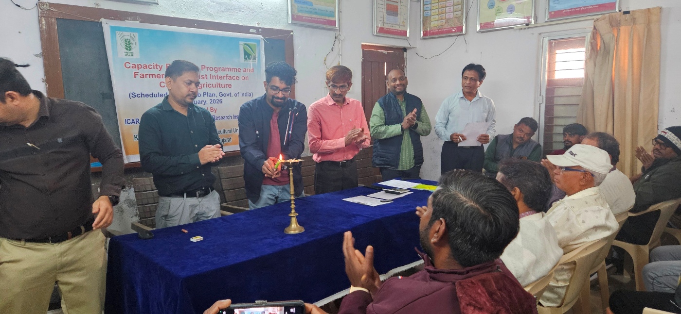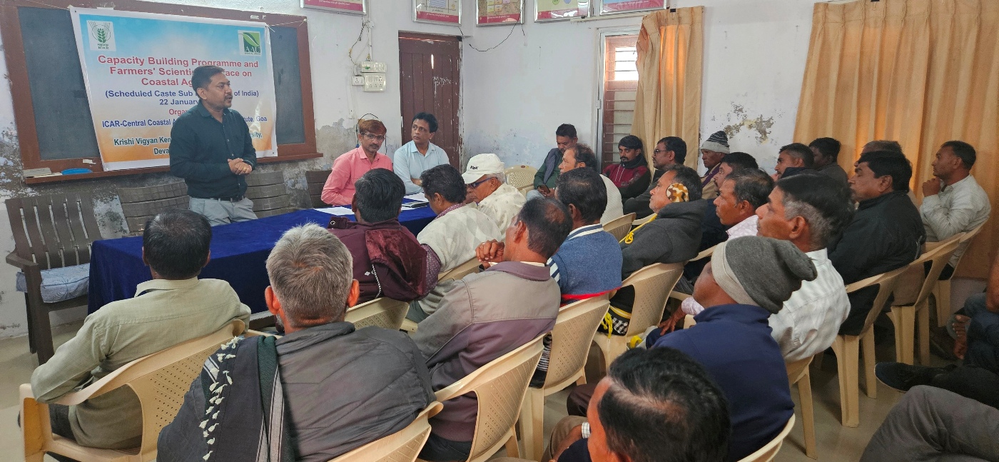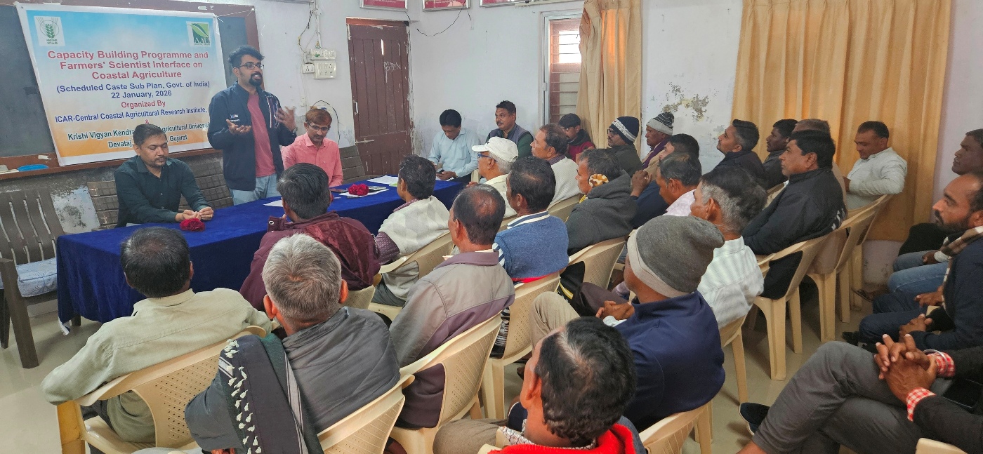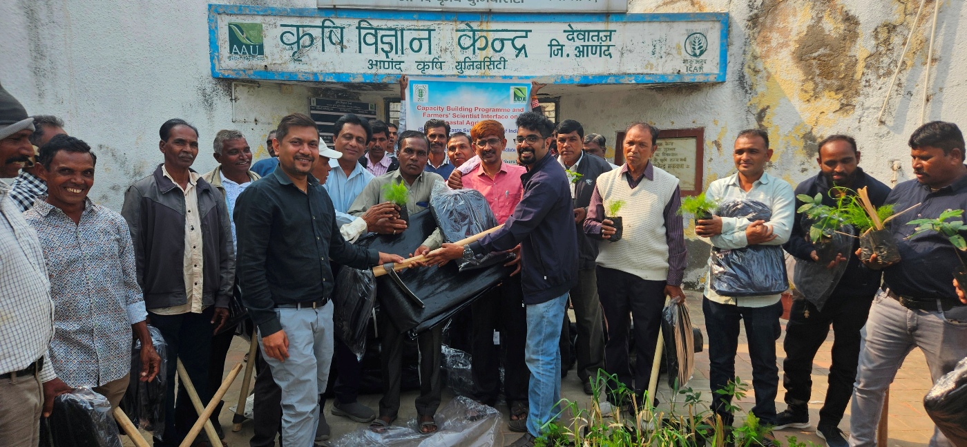 A one-day capacity building programme and input distribution programme was organized by ICAR-Central Coastal Agricultural Research Institute (CCARI), Goa at Krishi Vigyan Kendra (KVK), Devataj, Sojitra, Anand (Gujarat) on 22 January 2026, in collaboration with Anand Agricultural University (AAU), Anand, Gujarat. The programme commenced with the welcome address by Dr. R. M. Patel, Subject Matter Specialist (Plant Protection), KVK Devataj, Anand who welcomed all participants, scientists, and faculty members. The inaugural session began with the lighting of the lamp, followed by the University Agricultural Song of Anand Agricultural University, Anand.