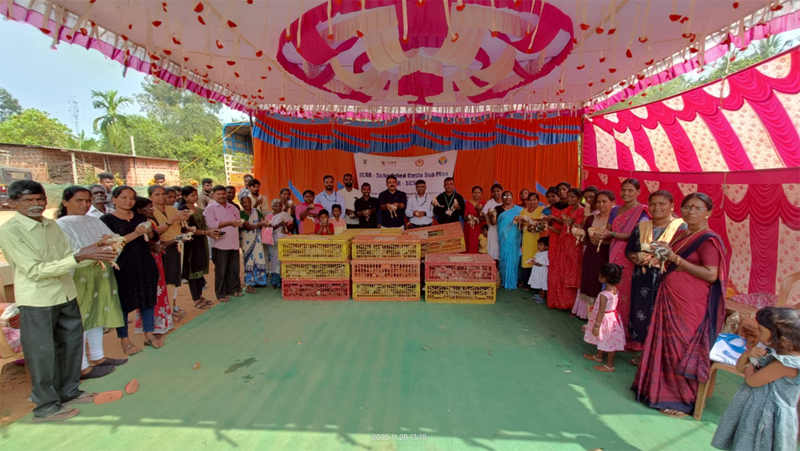 ICAR–Central Coastal Agricultural Research Institute, Goa conducted a Capacity Building Programme on “Scientific Management of Backyard Poultry” at Thaggarse village, Byndoor, Udupi district, Karnataka on 28 November 2025. The programme was organized under the Institute Scheduled Caste Sub Plan (SCSP) with the objective of strengthening the livelihood opportunities of resource-poor farmers through improved backyard poultry husbandry. A total of 30 Scheduled Caste farmers, including 28 women and 2 men, participated actively in the programme. During the technical sessions, Dr. Shirish Narnaware, Senior Scientist (Veterinary Pathology), delivered an insightful lecture on disease management in poultry, highlighting early diagnosis, preventive health care, and vital biosecurity measures for maintaining flock health. Dr. Amiya Ranjan Sahu, Scientist (Animal Genetics and Breeding), explained hatchery operations, brooding management, and marketing strategies for eggs and poultry birds to enhance farmers’ income. Dr. Udharwar Sanjaykumar Vithalrao, SMS (Animal Science), guided the participants on the scientific care and management of chicks, growers, and layers, including appropriate housing arrangements and feeding management. As part of the input support, 625 nos. of Giriraja birds, 2.5 tons of layer feed, and veterinary medicinal supplements useful for both poultry and dairy animals were distributed to the beneficiaries to promote scientific rearing and improve productivity at the village level. The programme enhanced the knowledge and confidence of the participants, and the input distribution was expected to support the development of sustainable backyard poultry units while generating additional income for the beneficiary families. The programme was successfully coordinated by Dr. Amiya Ranjan Sahu, Dr. Udharwar S. Vithalrao, and Dr. Shirish Narnaware.