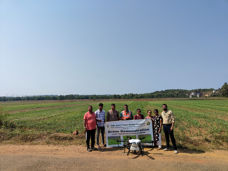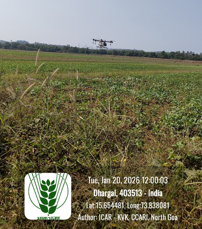 An agricultural drone spray demonstration was conducted at Dhargal village, Pernem taluka, North Goa, on 21 January 2026 by ICAR–Krishi Vigyan Kendra, North Goa, ICAR–Central Coastal Agricultural Research Institute, Goa, in collaboration with ATMA (North), Directorate of Agriculture, Government of Goa. The programme showcased drone-based foliar nutrition for the cowpea crop over an area of 2.5 hectares, with the objective of raising awareness of the use of drones in modern agriculture.