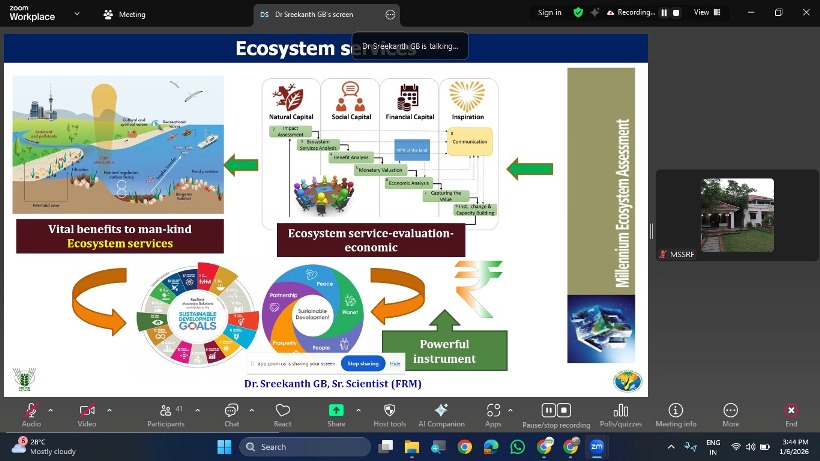 An online webinar on “Ecosystem Service Evaluation of Mangroves and Estuaries” was organized on 6 January 2026 by MS Swaminathan Research Foundation, Chennai, Tamil Nadu featuring Dr. Sreekanth G. B., Senior Scientist (Fisheries Resource Management), ICAR–CCARI, Goa, as the resource person. The session provided valuable insights into the ecological and socio-economic significance of mangrove and estuarine ecosystems, with a special focus on methods for valuing ecosystem services. The webinar drew around 90 participants, comprising nearly 60% students and 40% researchers, scientists, farmers, and fisherfolk, reflecting strong interdisciplinary participation. Attendees represented a wide range of reputed institutions and organizations across India, including BNHS, IUCN, IIFM, TNAU, IIT, IACS, Dr. B. R. Ambedkar University, VCSG UUHF College of Forestry (Ranichauri), University of Kota, WII, Goa University, OP Jindal University, MSSRF, NCCR, and several other colleges and universities. During the interaction, Dr. Sreekanth encouraged participants to undertake research projects on ecosystem service evaluation of estuaries, mangroves, and wetlands, emphasizing their importance for sustainable management and policy planning.