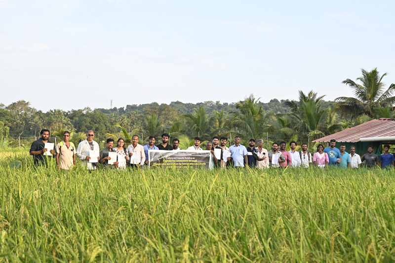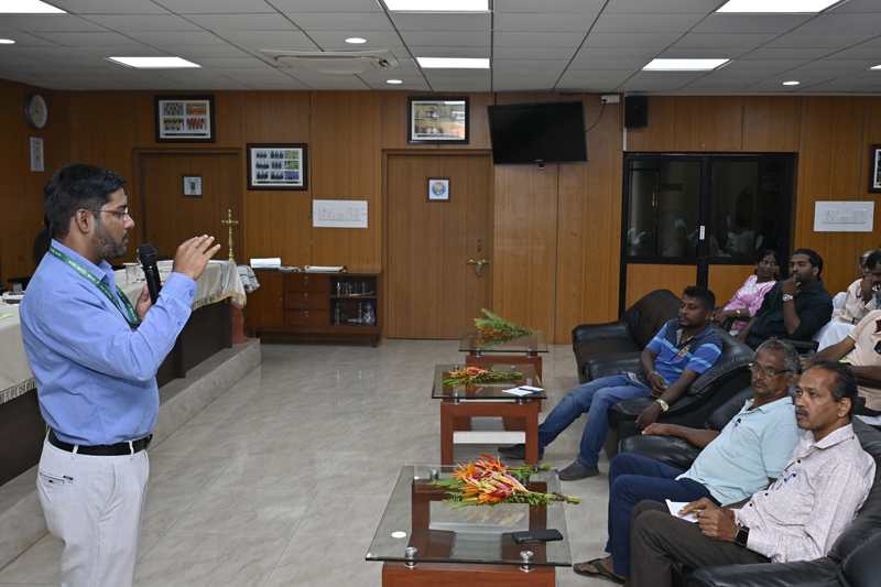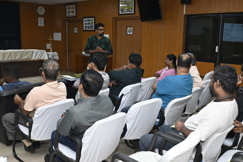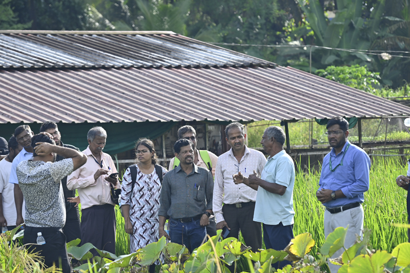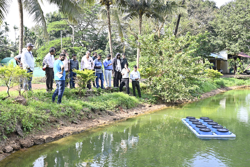 Following the technical lectures, participants were taken to the institute’s fish farm, where they observed ongoing activities including the innovative floating crab-barrel culture system, developed as part of adaptive aquaculture models for Khazan areas. The field demonstrations were held at the Khazan land farm at Merces, Goa where Mr. Joaquim D’Souza, a progressive farmer collaborating with ICAR-CCARI under the project shared his practical experiences, management strategies, and challenges encountered during implementation, and personally guided the participants on a tour of his farm. During this session, practical demonstrations were conducted. Mr. Harshvardhan Shetye, Young Professional (Fisheries Science), led a hands-on demonstration on fish stocking, pond management, feeding, and water quality monitoring, while Mr. Manish Patel demonstrated soil and water sample assessment techniques for agriculture. The programme also featured Farmers’ Experience Sharing and Farmer–Scientist Interaction sessions, which provided opportunities for mutual learning and feedback. The participants appreciated the technical sessions, hands-on exposure and practical demonstrations provided during the training. The event was coordinated by Shri Trivesh Mayekar, Scientist (FGB), Dr. Sreekanth G. B., Senior Scientist (FRM); Mr. Vishwajeet Prajapati, Technical Officer; Mr. Manish Patel, Technician (NRM); Mr. Harshvardhan Shetye and Mr. Mrudul Pendurkar, Young Professionals. The programme was aimed towards improving food security, production, livelihoods, and environmental services through the sustainable utilization and management of Goa’s unique Khazan land ecosystems.