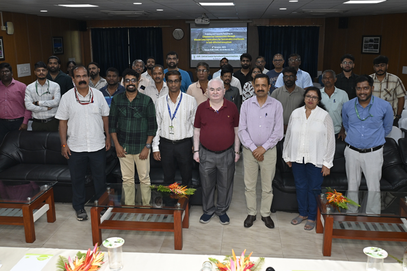 ICAR-Central Coastal Agricultural Research Institute (ICAR-CCARI), Goa organized a one-day Training and Capacity Building Programme on “Empowering Communities through Khazan Land Aquaculture for Sustainable Livelihoods in Salt-Affected Ecosystems” on 8th October 2025 under the NABARD funded project titled “Evaluating the Performance of Multispecies Finfish Culture in Small Low-Cost Ponds for Improving the Livelihood of Farmers in the Salt-Affected Coastal Saline Region of Goa”. Goa’s nearly 18,000 hectares of Khazan lands, traditionally managed as agro-aqua-forestry systems comprising paddy fields and salt pans, are increasingly threatened by soil acidity, salinity intrusion, and declining productivity; in this background, the training programme was organized to build awareness and capacity among farmers, students, and stakeholders on fish based integrated farming systems for Goa’s traditional Khazan lands. A total of 20 participants from different locations across Goa, including fish farmers, agricultural farmers, students, and farming enthusiasts, actively took part in the training. The programme commenced with a welcome address by Shri Trivesh Mayekar, Scientist (FGB), ICAR-CCARI, Goa, who introduced the objectives and importance of the training. Dr. N. H. Kelawala, Vice Chancellor, Kamdhenu University, Gandhinagar, Gujarat, graced the occasion as Chief Guest and appreciated ICAR-CCARI’s initiatives in promoting sustainable aquaculture in coastal regions. Dr. Parveen Kumar, Director, ICAR-CCARI, Goa, delivered the inaugural address, emphasizing the significance of Khazan ecosystems as traditional agro-aqua-forestry systems and the institute’s efforts toward promoting sustainable livelihood options in saline-affected coastal regions. Shri Rupesh Bhamaikar, DDM, NABARD, Goa, graced the occasion as the Guest of Honour and highlighted NABARD’s initiatives in supporting sustainable aquaculture and community-based livelihood projects in coastal areas. The technical sessions covered multiple aspects of Khazan-based aquaculture and integrated farming practices. Shri Trivesh Mayekar delivered lectures on “Candidate Fish and Shellfish Species for Aquaculture in Goa” and “Introduction to Khazan Ecosystem”, focusing on suitable species diversification and ecological perspectives of Khazan land aquaculture. Dr. Sreekanth G. B., Senior Scientist (FRM), presented a session on “Integrated Aquaculture Systems in Khazan Lands”, discussing the benefits of combining aquaculture with agriculture and livestock to enhance productivity and resilience. Dr Sujeet Desai, Scientist (Land and Water Management Engineering) explained the “Importance of Land Shaping in Khazan-based Rice, Fodder, and Vegetable Culture”, demonstrating how proper land and water management contribute to the success of integrated farming systems.