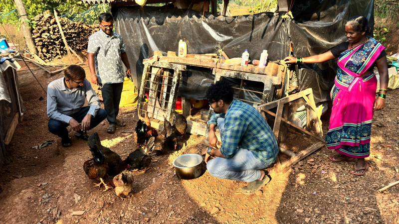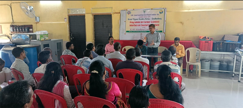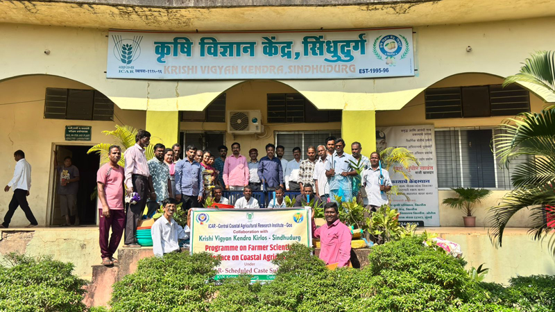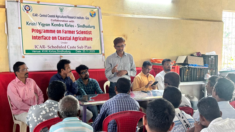 ICAR–Central Coastal Agricultural Research Institute (ICAR-CCARI), Goa, in collaboration with Krishi Vigyan Kendra (KVK), Kirlos, Sindhudurg, organized a Farmer-scientist interface and Input Distribution Programme at Kirlos, Tal. Malvan, Dist. Sindhudurg, Maharashtra, on 20 November 2025 under the Scheduled Caste Sub Plan (SCSP). Dr. Sreekanth GB, Senior Scientist, ICAR-CCARI welcomed the participants, outlined the SCSP scheme and activities of ICAR-CCARI, Goa and provided guidance on fisheries technologies, local fisheries resources and diversity, and recommended farm pond development and fish stocking procedures. Dr. Akula Reddy, Senior Scientist, ICAR-CCARI, briefly explained on the production technologies for spices and plantation crops, addressed issues in coconut and arecanut cultivation, and offered field-level advisories. Shri. Pradip Sawant, Vice-Chairman, Sindhudurg Zilla krushi Prathisthan, highlighted on the socioeconomic status and farming scenario of the Kirlos region. Shri. Bhaskar Kajarekar, SMS (Agronomy) and Shri. Balkrushna Gawade, SMS (Plant protection) shared brief information related to farmers’ needs and agricultural practices. Shri. SA Rane, SMS (Agril. Eng.), coordinator for the programme from KVK, provided a detailed information on various initiatives of the KVK in food processing and value addition of fruits and vegetables. Agricultural inputs such as planting materials (arecanut, nutmeg, and cashew), ghamelas, pickaxes, spades, billhooks, sickles, coconut climber, Azolla bed units, planting bags, trolleys, animal medicates, literature and vermicompost were distributed to the farmers. A field visit was also arranged to the rice fields and poultry units of the farmers with practical exposure to farm activities. A total of 20 SC farmers, including 16 males and 4 females, participated in the programme. The programme was successfully coordinated by Dr. Sreekanth GB, Dr. Akula Chinapolaiah, Dr. KV Desai (SMS, Animal Science), Shri. SA Rane and Mr. Mrudul Pendurkar, (YP1, ICAR-CCARI).