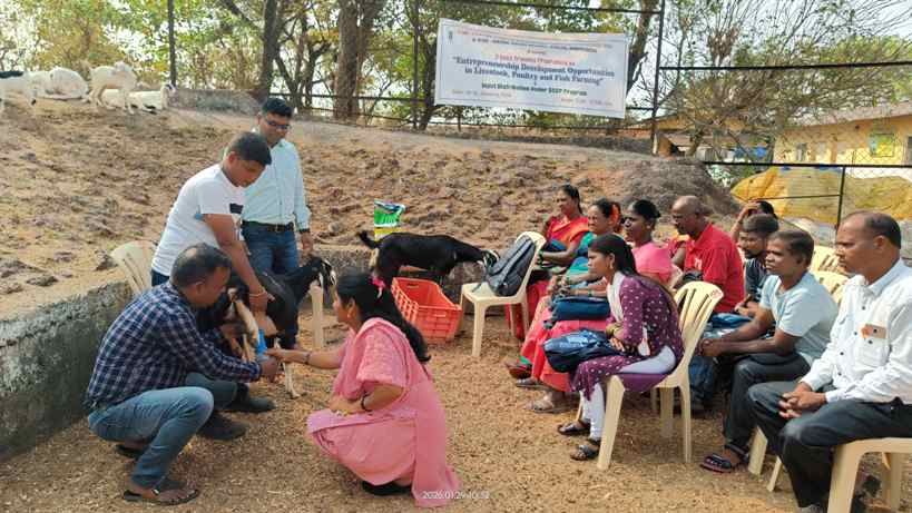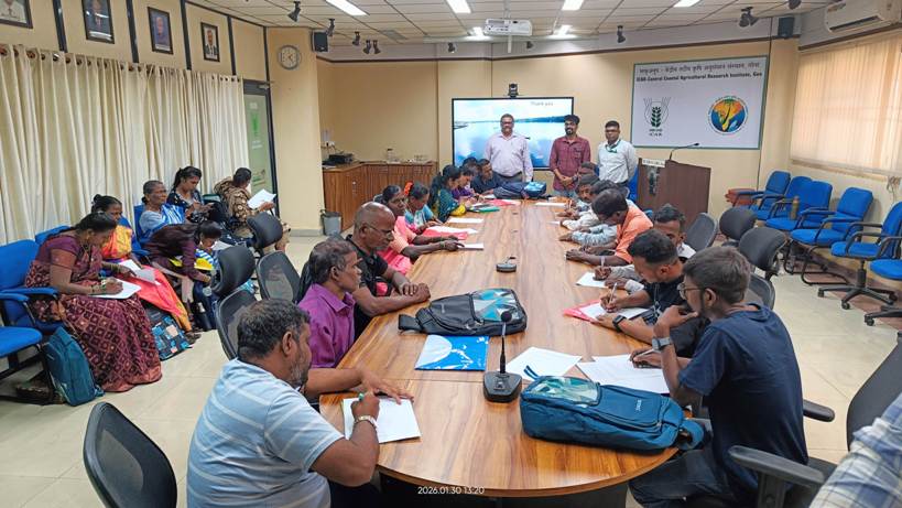 ICAR-Central Coastal Agricultural Research Institute, Goa conducted a three-days Training on ‘Entrepreneurship Development Opportunities in Livestock, Poultry, and Fish Farming’ at ICAR-CCARI, Goa from 28 to 30 January, 2026. The programme was conducted under Institute Scheduled Caste Sub Plan (SCSP) in collaboration with Krishi Vigyan Kendra, Kirlos, Sindhudurg with the aim of enhancing livelihood opportunities for Scheduled Caste farmers through improved and scientific livestock, poultry and fish farming practices. A total of 23 Scheduled Caste farmers, including 11 women and 12 men from Kirlos, Sindhudurg and Ponda, Goa participated enthusiastically in the training. The training program encompassed a blend of instructive theoretical lectures, informative practical field visits and demonstrations in institute’s dairy, poultry, piggery, fishery and goat farms facilitated by scientists and the project team of ICAR-CCARI, Goa. In addition, visit was also made in Livestock waste valorization system where the farmers were given demonstration on production of Phosphate Rich Organic Manure (PROM) and Jeevamrut.