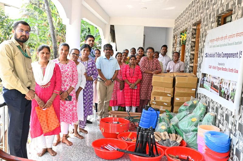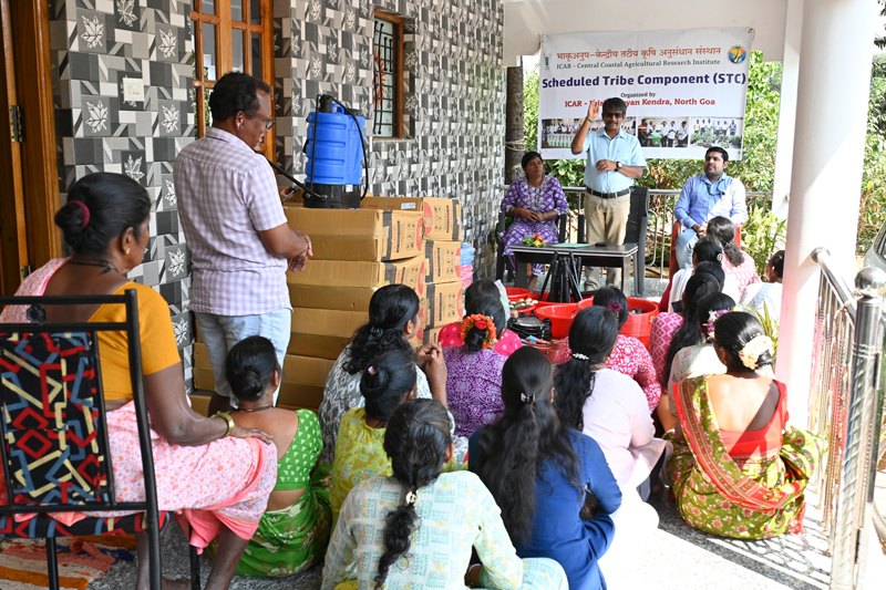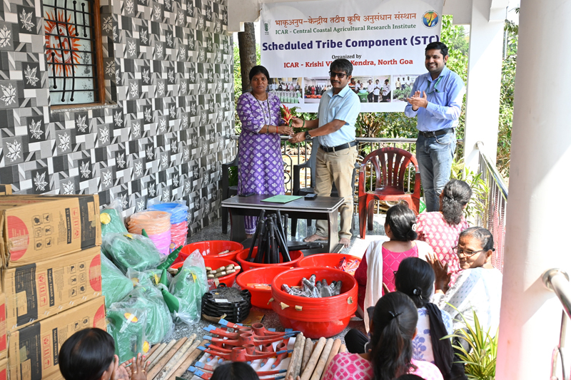 A training on Organic Farming and Input Distribution was organized by ICAR–Krishi Vigyan Kendra, Central Coastal Agricultural Research Institute, North Goa, on 19 January 2026 at Cumbharjua, Tiswadi, North Goa. The programme aimed to enhance farmers’ knowledge and skills on sustainable organic farming practices and the effective use of organic inputs. Ms. Sejal Narvekar, Panch Member, Cumbharjua, attended the programme as the Guest of Honor and highlighted the importance of organic farming for sustainable agriculture and rural livelihoods. Dr. N. Bommayasamy, Senior Scientist & Head, ICAR–KVK, North Goa, briefed the program and highlighted sustainable organic farming practices, such as selection of seeds, organic seed treatment, enriched organic manure with biofertilizers, intercropping systems, and organic pest & disease management practices. The inaugural session began with a welcome address by Mr. Rahul Kumar, SMS (Agronomy), ICAR–KVK, North Goa, followed by a brief overview of the programme by Dr. N. Bommayasamy, Senior Scientist & Head, ICAR–KVK, North Goa. Mr. Rahul Kumar, SMS (Agronomy), explained the preparation and use of liquid organic manures, such as Jeevamrit, Beejamrit, and Panchagavya, as well as organic vegetable production techniques. A total of 25 farmers participated in the programme, including 10 males and 15 females, reflecting strong interest and active involvement from the local farming community. An interactive feedback session enabled participants to share experiences and clarify their queries with the experts. As part of the programme, farm implements were distributed to 20 participants, including Pikas, Sickle, rose can, knapsack sprayer, Bucket, Khurpi, hand hoe, spade, sickles, baskets, Sharpening Stone, etc., under the scheduled tribal component. The program was organized by Mr. Rahul Kumar and Dr. N. Bommayasamy as Course Directors with technical support of Mr. Vishwajeet Prajapati and Mr. Aishwar Kumar Tiwari, Technical Trainee.