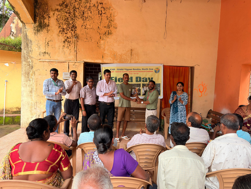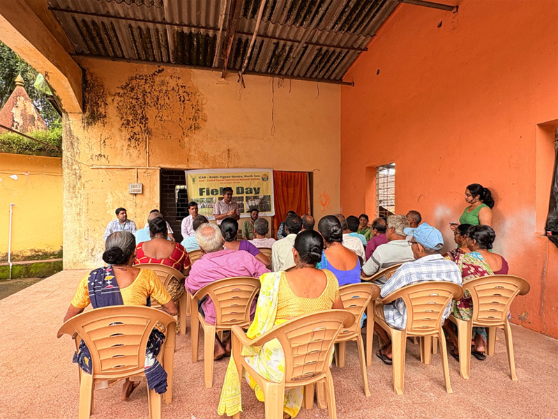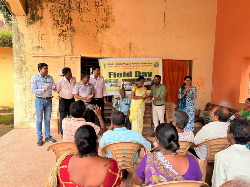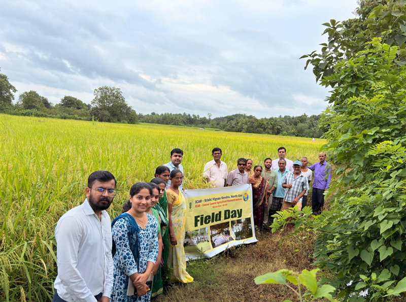 A field day on salt-tolerant paddy varieties was organized by ICAR–Krishi Vigyan Kendra, Central Coastal Agricultural Research Institute, Goa, at Torse village, Pernem, on 26 September 2025, with the objective of promoting awareness and encouraging the adoption of salt-tolerant paddy varieties among local farmers. Shri Ranjit Mhapsekar, Zonal Agriculture Officer, Pernem, briefed the Swayampurna Goa program on assistance for farm mechanization, high-yield and certified seeds, fencing, community farming, and revitalization of Khazan lands, among other initiatives, and facilitated the exchange of practical knowledge and valuable feedback from the local paddy growers. Dr. N. Bommayasamy, Senior Scientist & Head, ICAR-KVK, North Goa, briefly described about the program. He emphasized the importance of promoting salt-tolerant paddy cultivars, particularly in the Khazan areas. These cultivars help address soil salinity and waterlogging, which are common in coastal regions, making it possible to restore agriculture in challenging conditions. Dr. Shripad Bhat, Senior Scientist (Agrl. Economics), ICAR-CCARI, Goa spoke about the benefits of growing salt-tolerant paddy varieties Goa Dhan-4 and Goa Dhan-5. He explained that these varieties are more profitable than traditional ones, as they give better yields and require less investment. This makes them a good option for small and marginal farmers, especially in Goa's conditions.