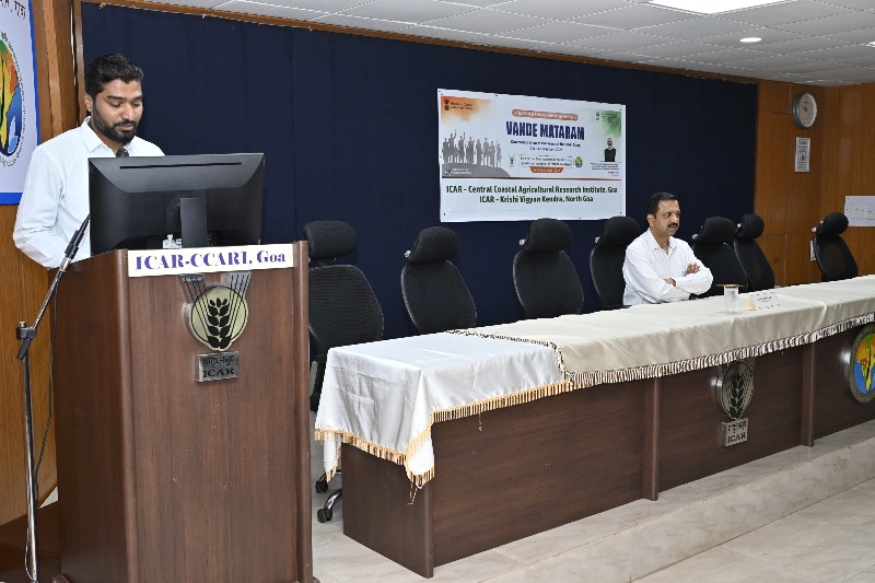 ICAR - Central Coastal Agricultural Research Institute, Goa launched the Commemoration of 150 Years of ‘Vande Mataram’ the National Song, with mass singing of the “Vande Maratam” by the officials and staff of the Institute and KVK, North Goa on 7th November, 2025. This year-long commemorative programme across the country aims to highlight the contribution of Bankim Chandra Chatterjee and reaffirm the values of unity, sacrifices and love for the nation embodied in Vande Mataram. The commemoration will be observed from 07th November 2025 to 7th November 2026 in four phases. Dr. Parveen Kumar, Director, ICAR-CCARI, briefed the importance and significance of this Commemoration of 150 Years of ‘Vande Mataram’ with the background of the song and how it became an anthem for the freedom fighters. All staff members of the Institute and KVK North Goa participated in the mass singing of ‘Vande Mataram’. Dr. Vinod A. Ubarhande and Dr. N. Bommayasamy, Nodal officers for this commemoration programme coordinated the launch with mass singing, with technical support from Shri Vishwajeet Prajapati.